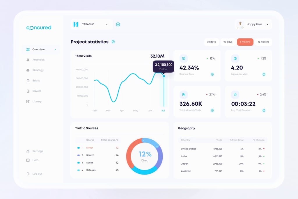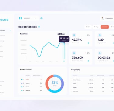 AI-powered web analytics dashboard showcasing key visitor statistics, traffic sources, and geographic data for efficient and clear web performance monitoring