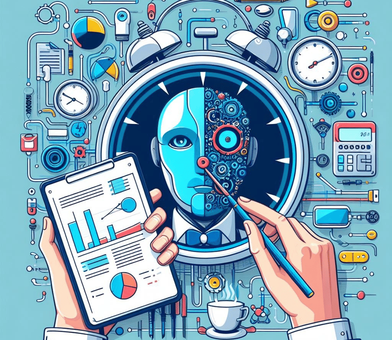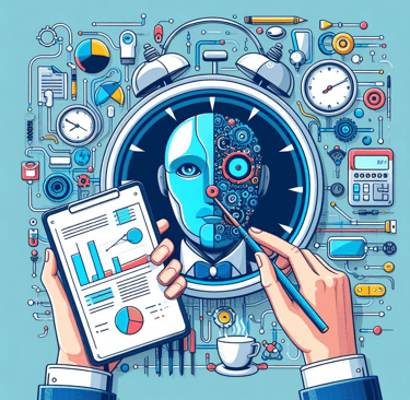 Illustration of time management and productivity tools featuring analytics, AI indicators, and a classic alarm clock symbolizing efficiency and automation
